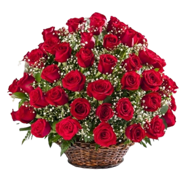 Impresionante canasto con 50 rosas frescas. Ideal para celebrar momentos importantes con un arreglo floral lleno de elegancia y color.
