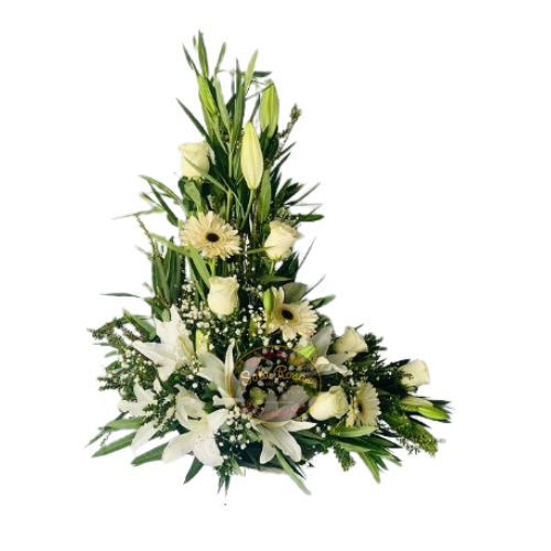 Este arreglo fúnebre en tonos blancos combina la pureza de las rosas, la elegancia del lirio y la delicadeza de las gerberas, creando un símbolo de paz y despedida con honor.”