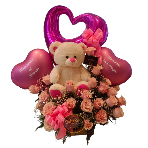 La canasta decorativa sostiene firmemente las flores y, además, aporta elegancia al conjunto. El peluche central añade un toque afectivo que, sin duda, transforma el arreglo en un recuerdo memorable. Por otro lado, los globos metálicos refuerzan el mensaje romántico y aumentan el impacto visual del regalo.