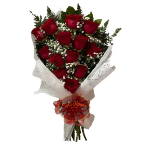 Este hermoso ramillete incluye 12 rosas rojas frescas, acompañadas de gypsophila blanca (velo de novia) y follaje verde decorativo, lo que crea un contraste delicado y elegante. El diseño se envuelve con papel blanco texturizado con detalles florales, y se completa con un lazo rojo amplio que realza su presentación romántica y sofisticada.