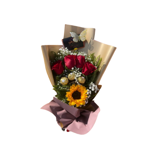 Ramo de 4 Rosas y Girasol con 3 chocolates color de papel en existencia